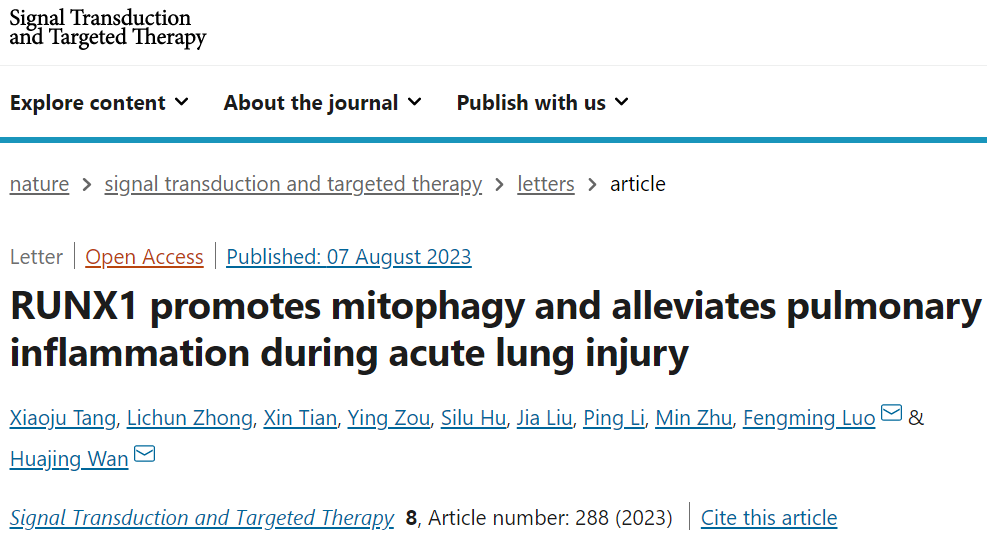 四川大学万华靖/罗凤鸣发现RUNX1在急性肺损伤期间促进线粒体自噬并减轻肺部炎症!